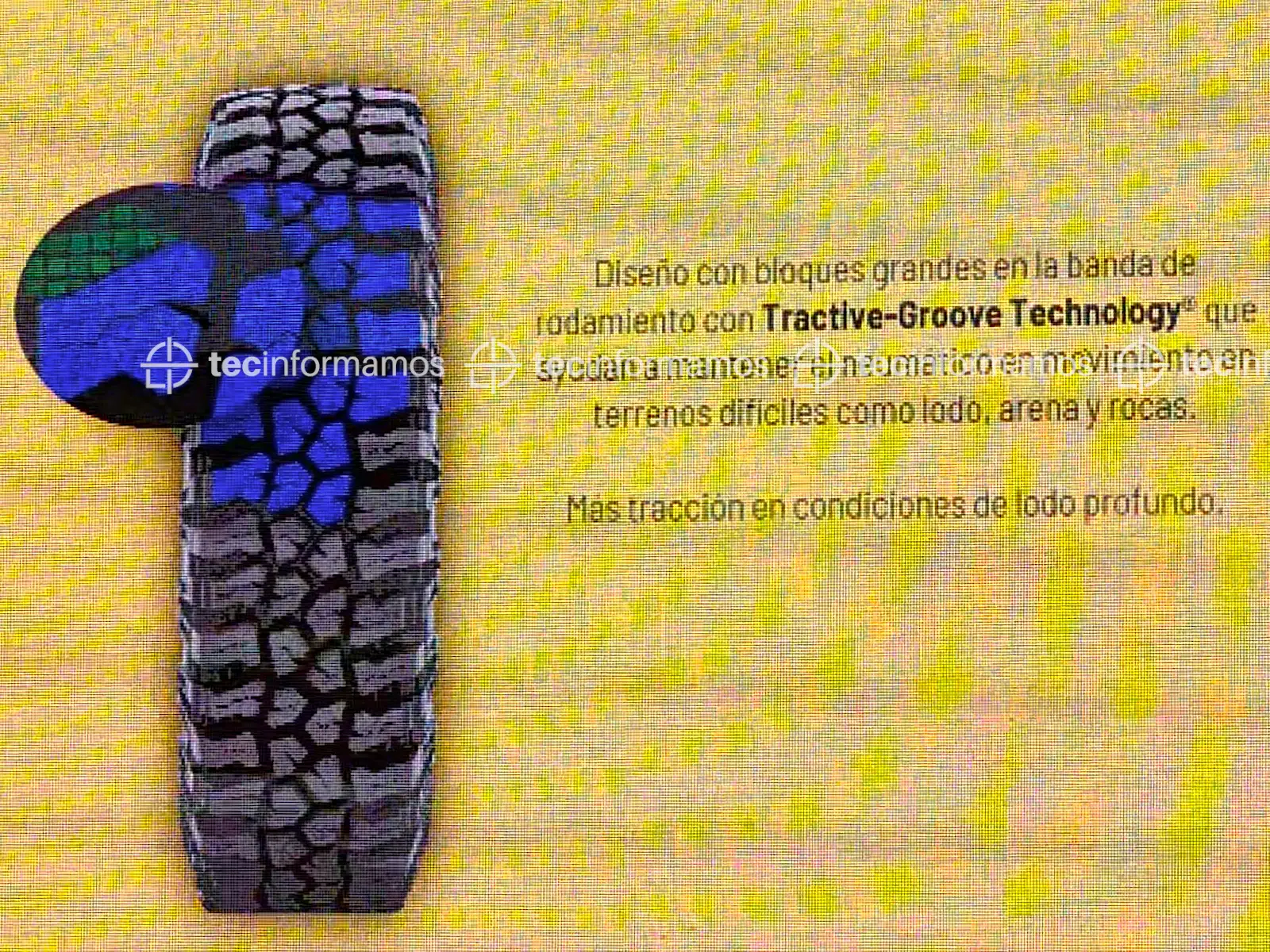 Además, los surcos de la banda de rodamiento incorporan tecnología Tractive-Groove, la cual incopora pequeñas protuberancias que ayudan a expulsar el barro y a mantener la tracción, incluso en los terrenos más difíciles.