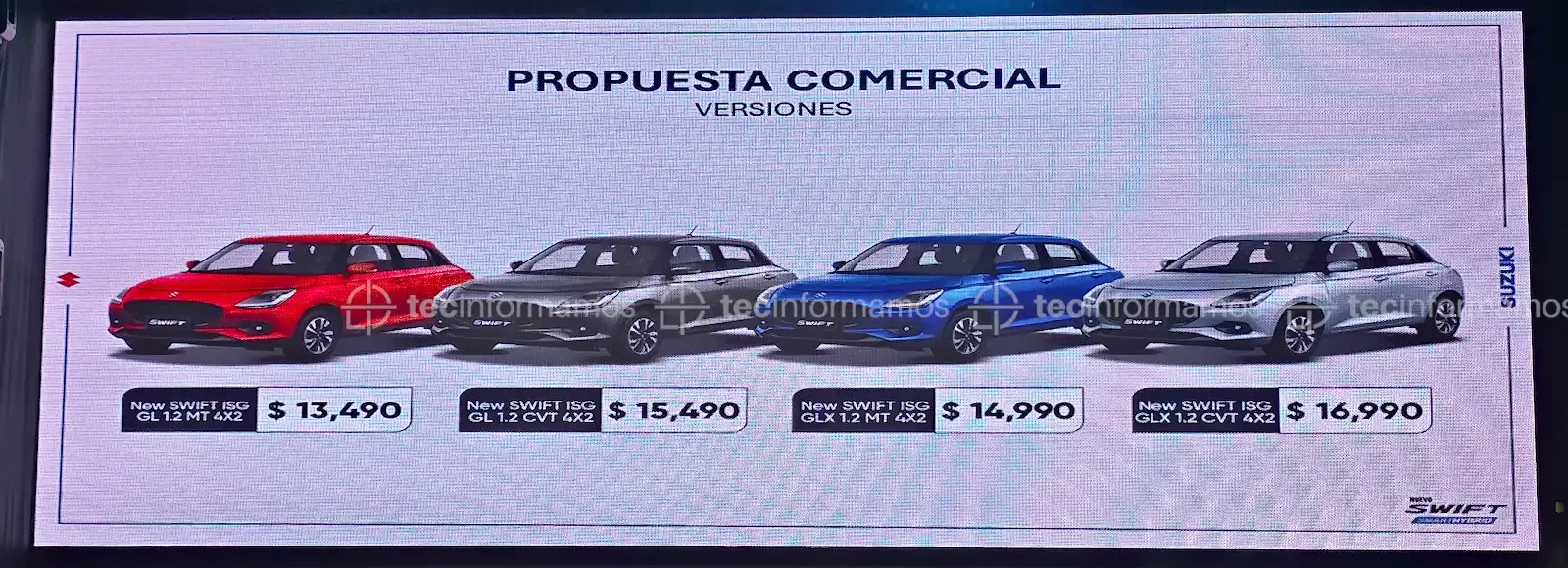El Suzuki Swift Smart Hybrid cuesta $13,490 en Perú (versión GL MT). La versión GL CVT cuesta $15,490 mientras que las versiones GLX MT y GLX CVT cuestan $14,990 y $16,990, respectivamente.