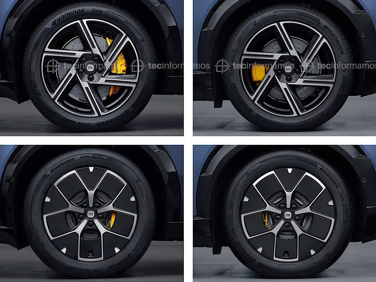 La primera imagen muestra el frente y el lado del SU7 y del YU7, mientras que la segunda imagen muestra el trasero de los vehículos eléctricos de Xiaomi.