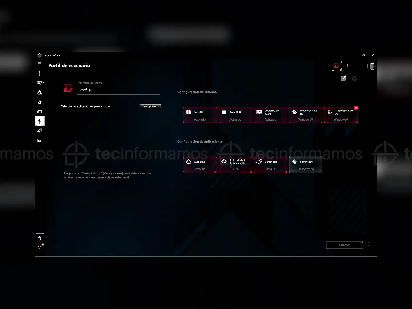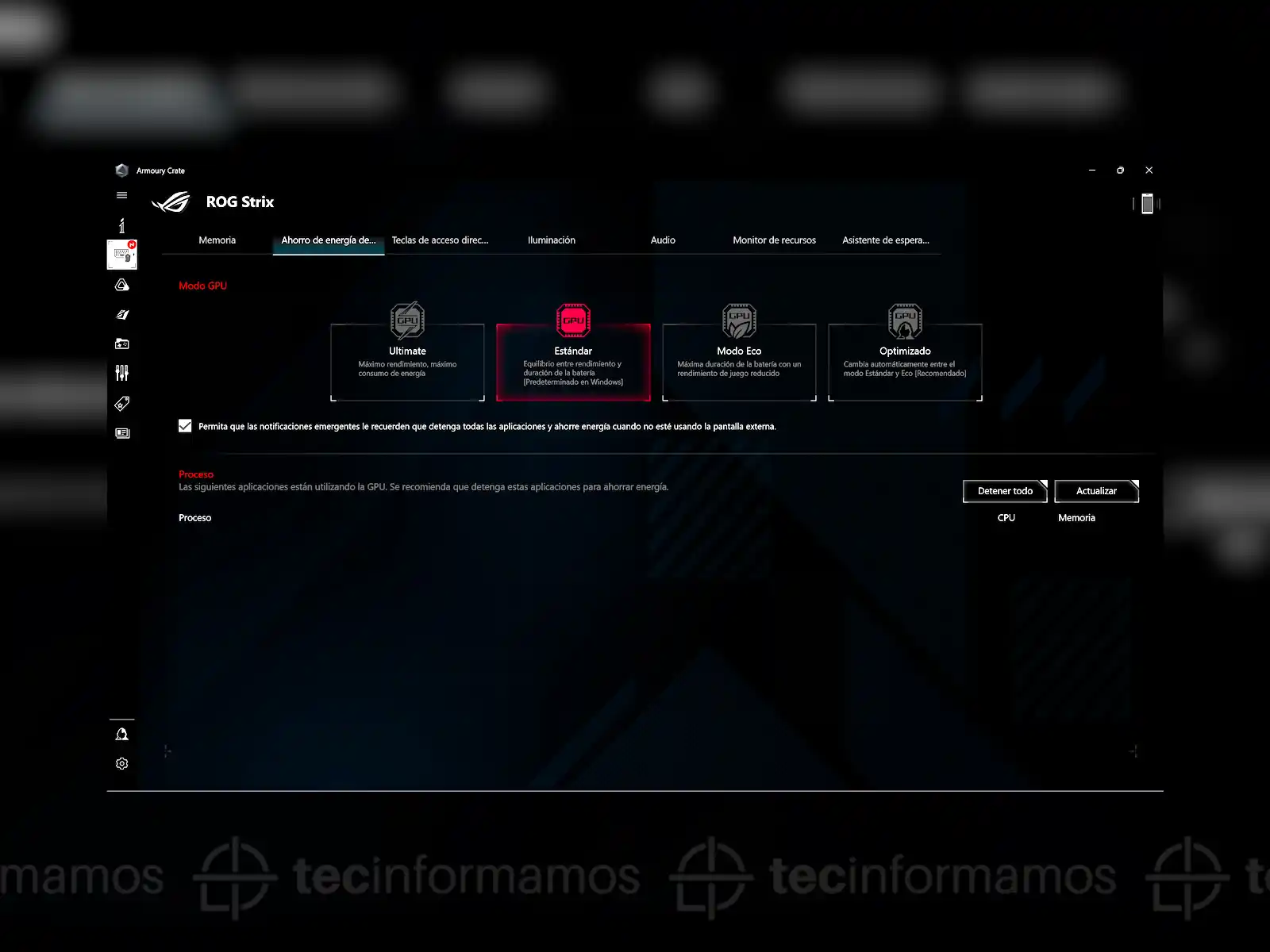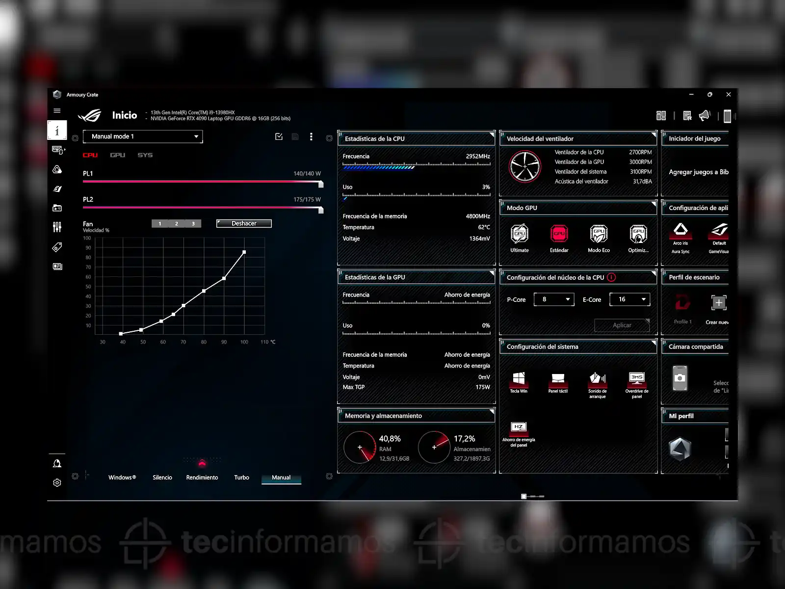 Podrás configurar las Hot Keys, el color de las teclas del teclado, el rendimiento del procesador (Windows, Silencio, Rendimiento, Turbo, Manual), la calibración de la pantalla, así como también el rendimiento de la GPU (Estándar, Modo Eco, Optimizado, Ultimate).