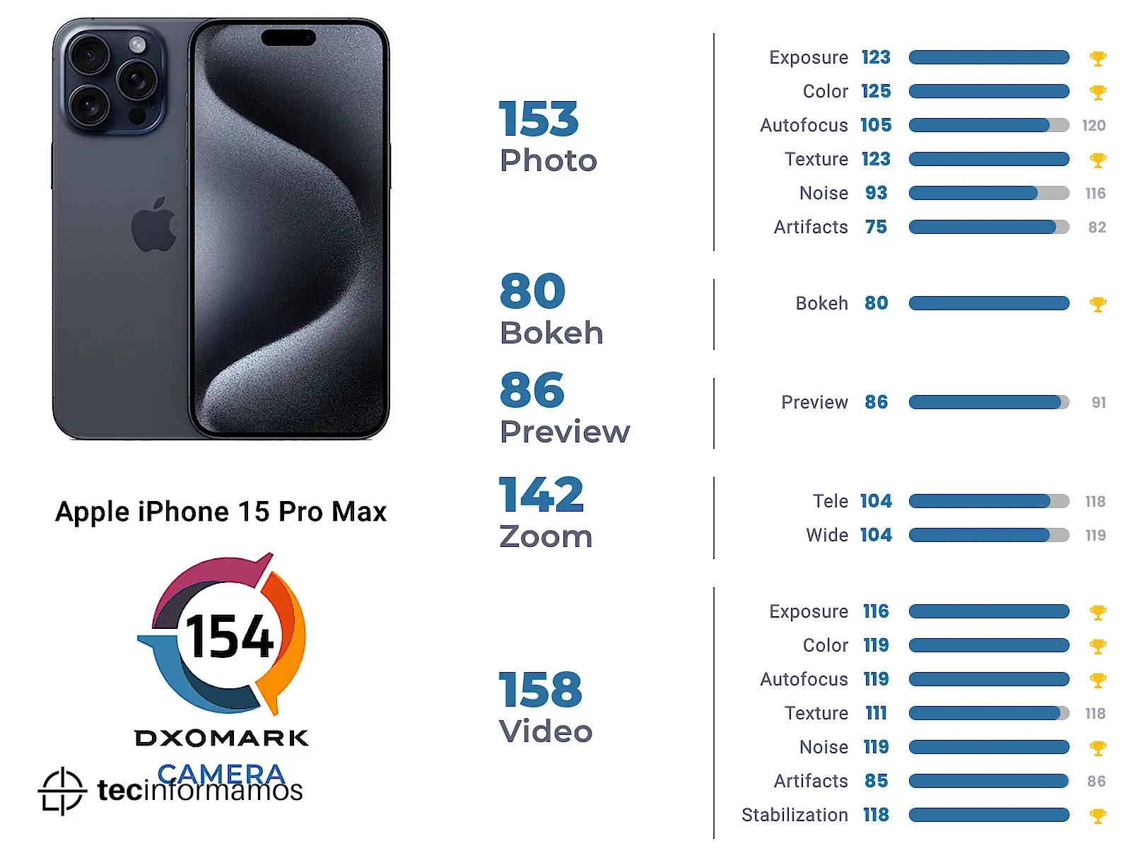 El iPhone 15 Pro Max obtuvo 154 puntos (puntaje combinado) en el ranking de DXOMARK, el cual combina 5 aspectos (Fotografía, Bokeh, Previsualización, Zoom, Video).