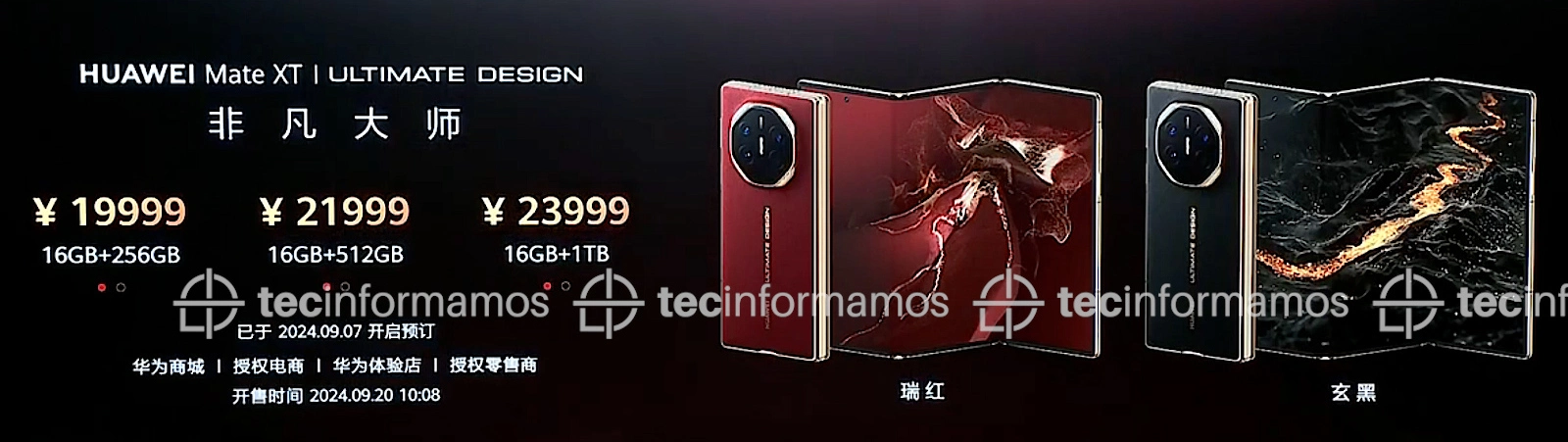 El HUAWEI Mate XT cuesta CNY19,999 ($2809) en la configuración con 16/256GB, mientras que las configuraciones con 16/512GB y 16GB/1TB cuestan CNY21,999 ($3090) y CNY23,999 ($3370), respectivamente.