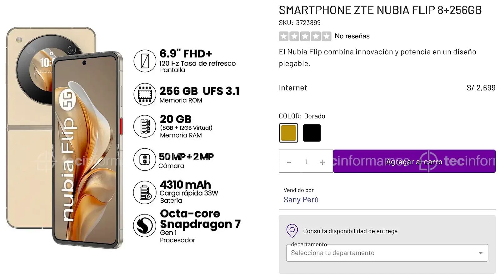 El nubia Flip 5G cuesta S/2699 en Perú y llega en una única configuración con 8GB RAM + 256GB de almacenamiento interno.