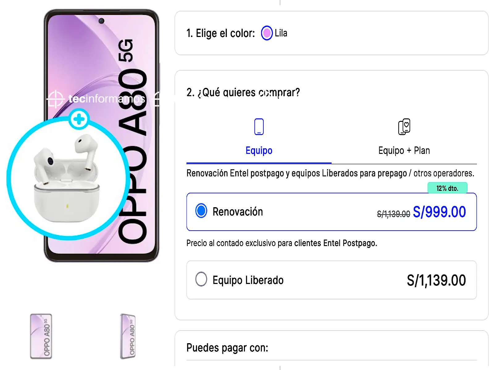El OPPO A80 5G cuesta entre S/849 y S/1259 en Perú. El precio del dispositivo depende del operador, plan y modalidad en el que lo compres.