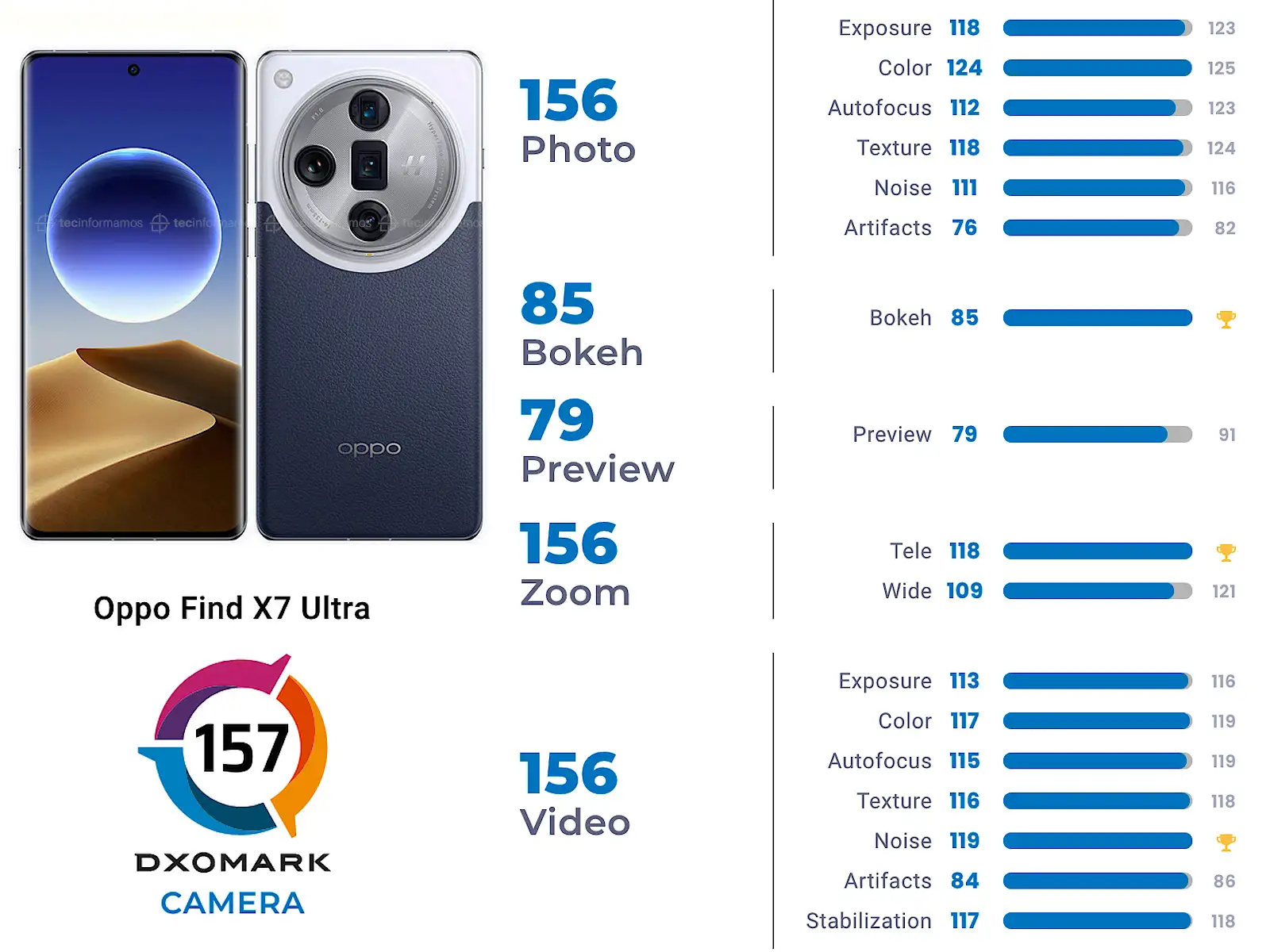 El OPPO Find X7 Ultra obtuvo 157 puntos (puntaje combinado) en el ranking de DXOMARK, el cual toma en cuenta 5 aspectos (Fotografía, Bokeh, Previsualización, Zoom, Video).