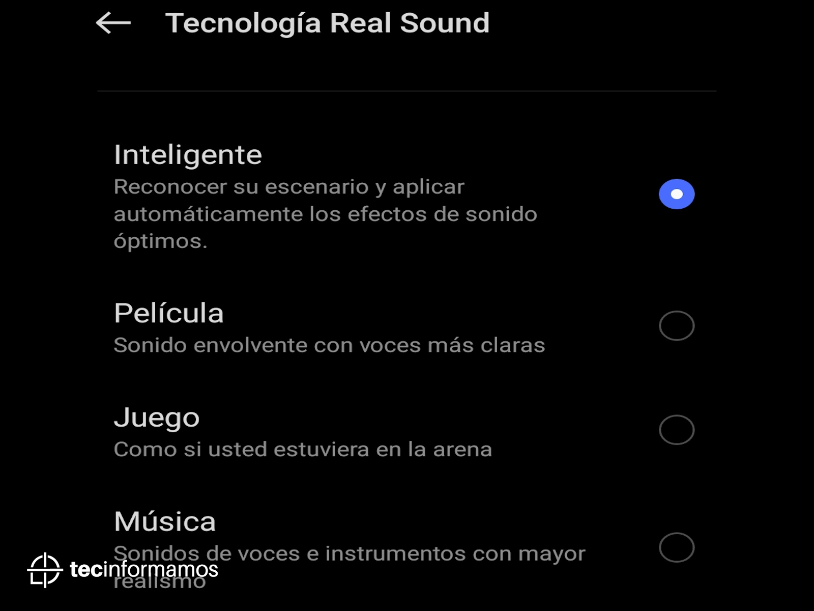 Este smartphone viene con tecnología Real Sound, la cual permite personalizar la experiencia de audio con 4 presets (Inteligente, Película, Juego, Música). Lamentablemente, no tenemos un ecualizador ni tampoco certificación Dolby ATMOS.