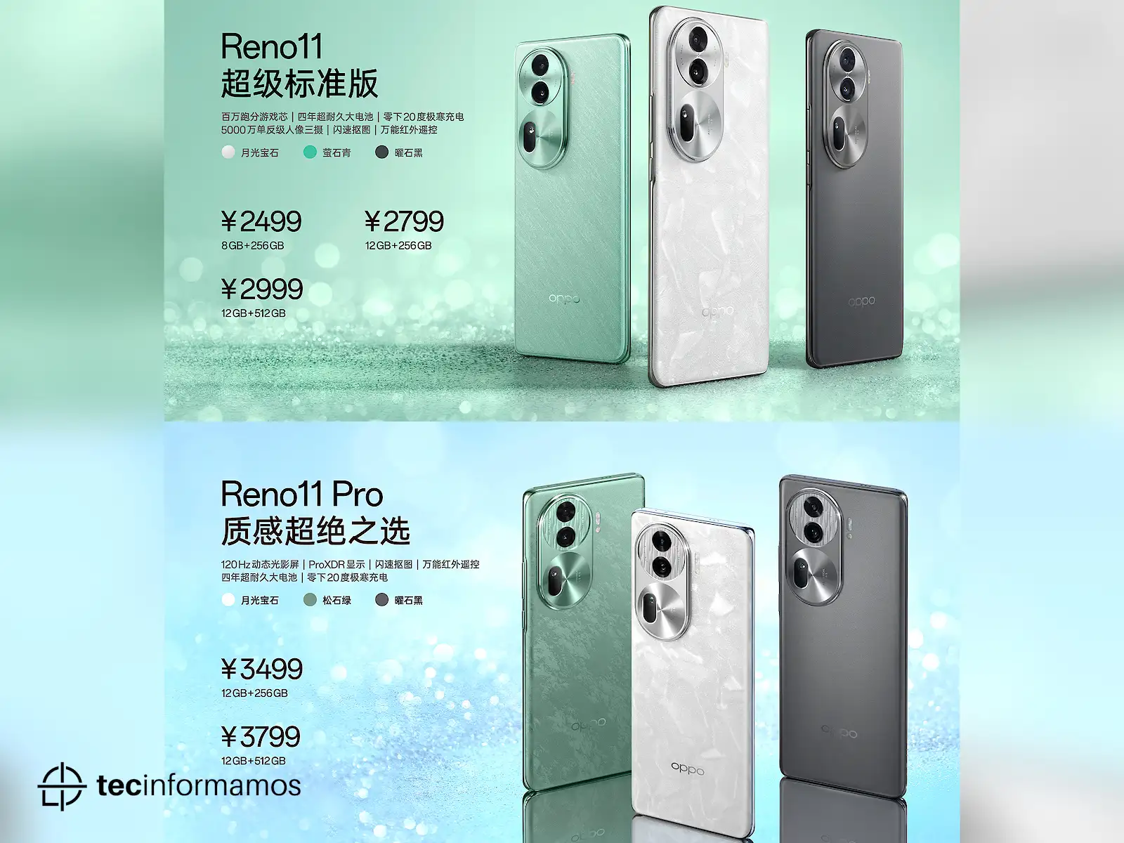 Por su parte, el OPPO Reno 11 Pro con 12/256GB cuesta CNY3499 ($493), mientras que la configuración con 12/512GB cuesta CNY3799 ($535).