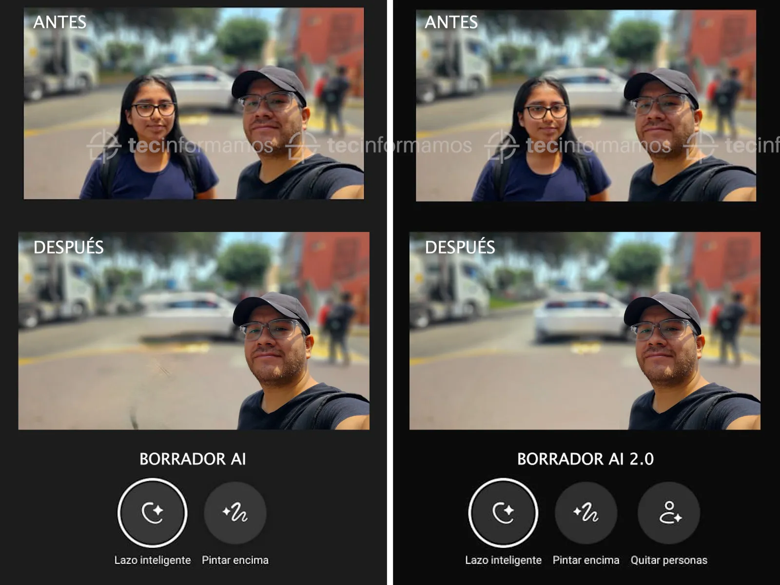 Esta función también está presente en otros dispositivos de la marca, pero la versión 2.0 funciona mejor y ofrece un botón llamado Quitar personas, además de los botones Lazo inteligente y Pintar encima que ofrece la versión anterior de Borrador AI.