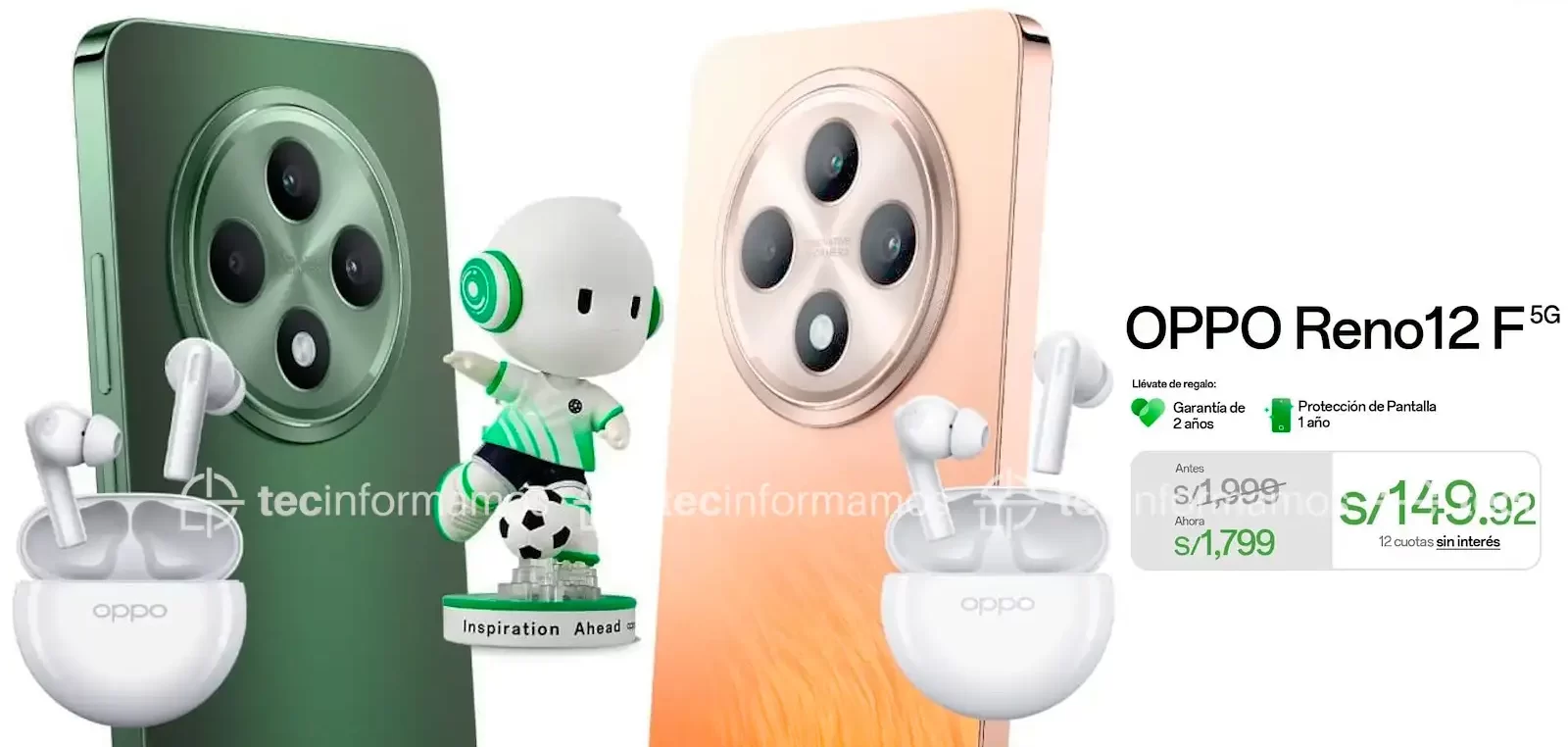 El OPPO Reno12 F cuesta S/1799 en Perú. La preventa va del 8 al 30 de septiembre e incluirá 2 años de garantía, reparación de pantalla gratuita dentro de los primeros 12 meses, auriculares OPPO Enco Buds2 y un Ollie Funko Champions.