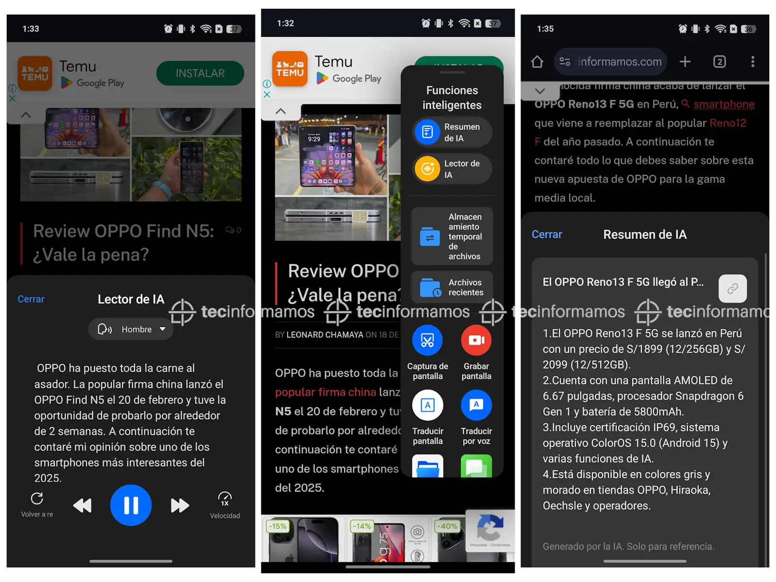 Y por si eso fuera poco, el Reno13 F 5G llega cargado con funciones de Inteligencia Artificial como Studio AI, Traductor de Pantalla, Escritor AI, Resumen AI.