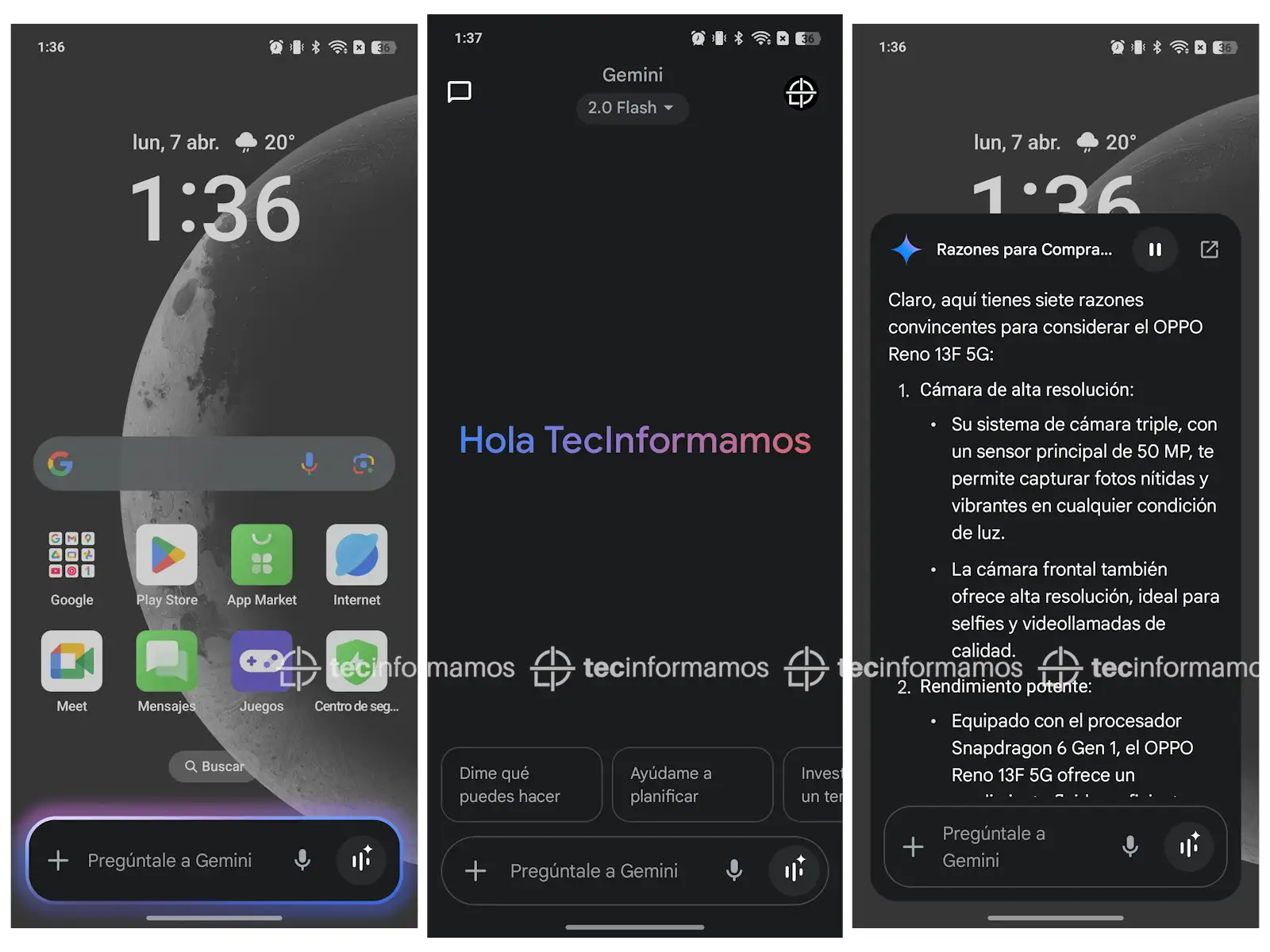 Además, OPPO viene trabajando de la mano con Google y gracias a ello tenemos acceso a Google Gemini, el cual es un asistente personal que, usando texto, voz, fotos y la cámara, te ayudará a aprender de nuevas maneras, redactar correos, planear eventos y más.
