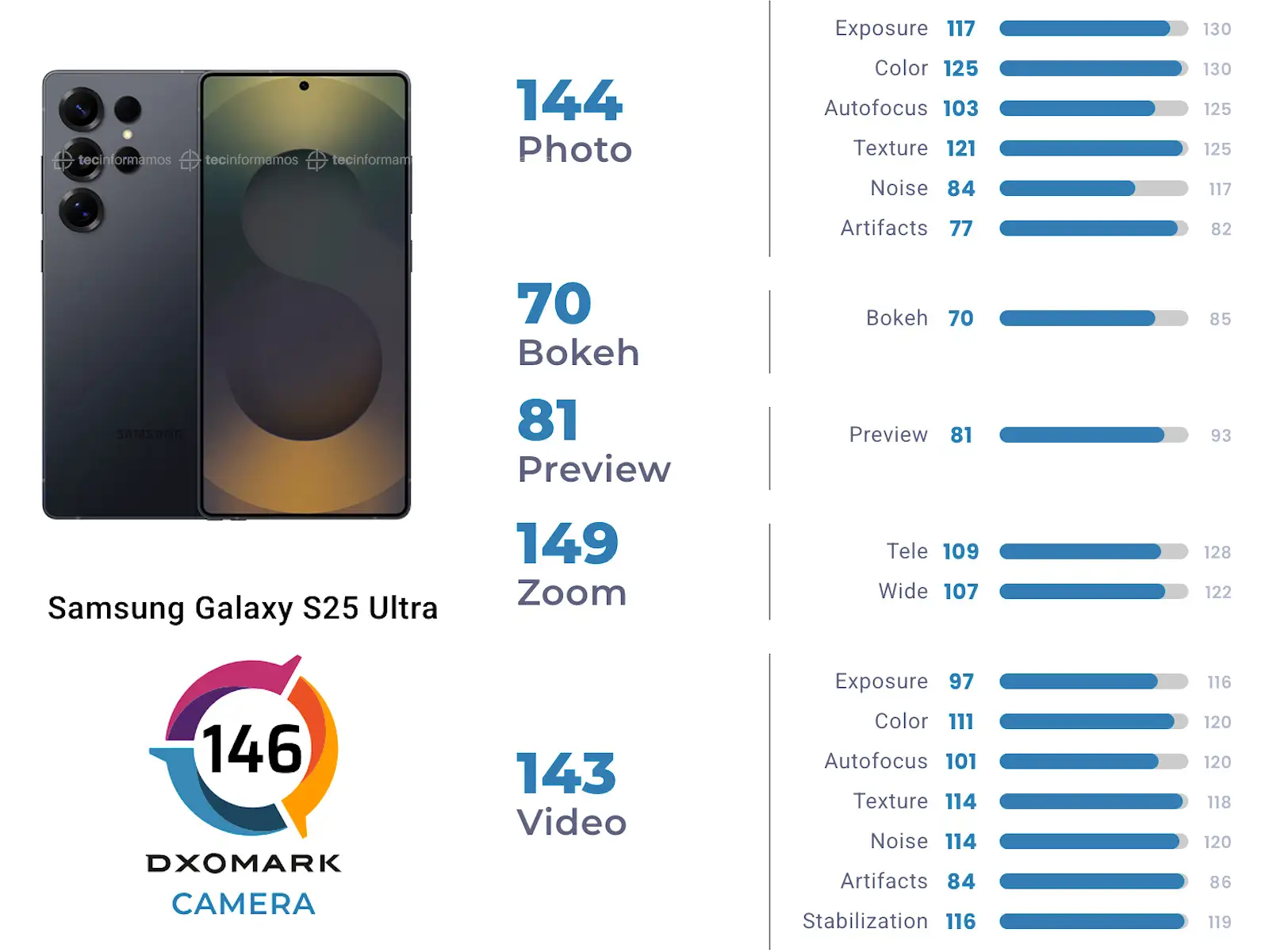El Samsung Galaxy S25 Ultra obtuvo 146 puntos (puntaje combinado) en el ranking de DXOMARK, el cual toma en cuenta 5 aspectos (Fotografía, Bokeh, Previsualización, Zoom, Video).