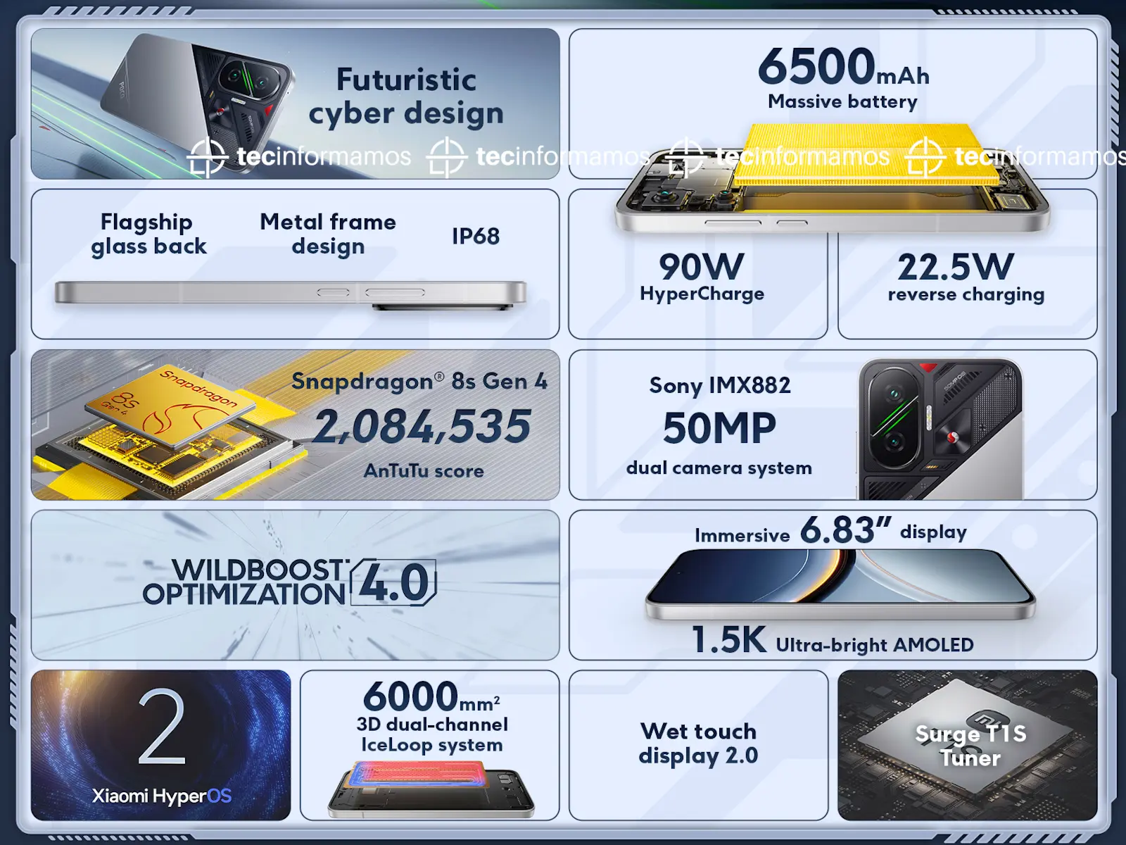 Algo que también llama la atención es la batería del nuevo POCO. Hablamos de una batería de 6500mAh, la cual soporta carga rápida de 90W y carga inversa de 22.5W mediante USB-C.
