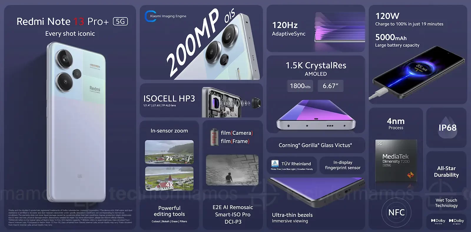 El integrante más poderoso y llamativo de la Serie Redmi Note 13 es el Redmi Note 13 Pro+ 5G. Este smartphone trae un procesador MediaTek Dimensity 7200-Ultra (4 nm) y configuraciones con hasta 12/512GB.