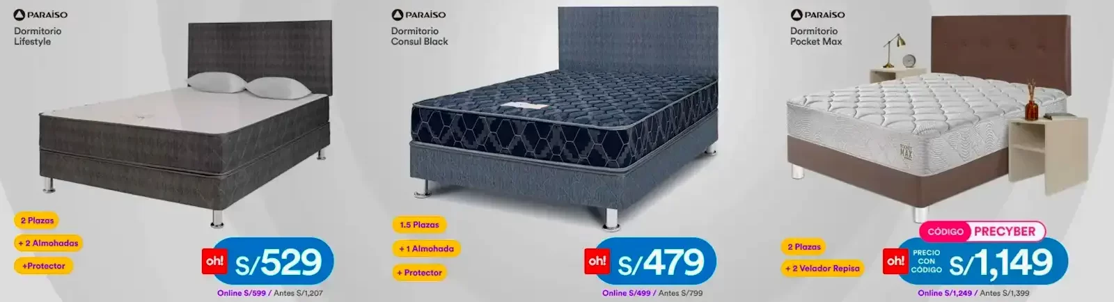 También podrás comprar camas a precios super bajos. Por ejemplo, la reconocida marca Paraíso ofrede varias opciones con precios que inician en poco menos de S/500.