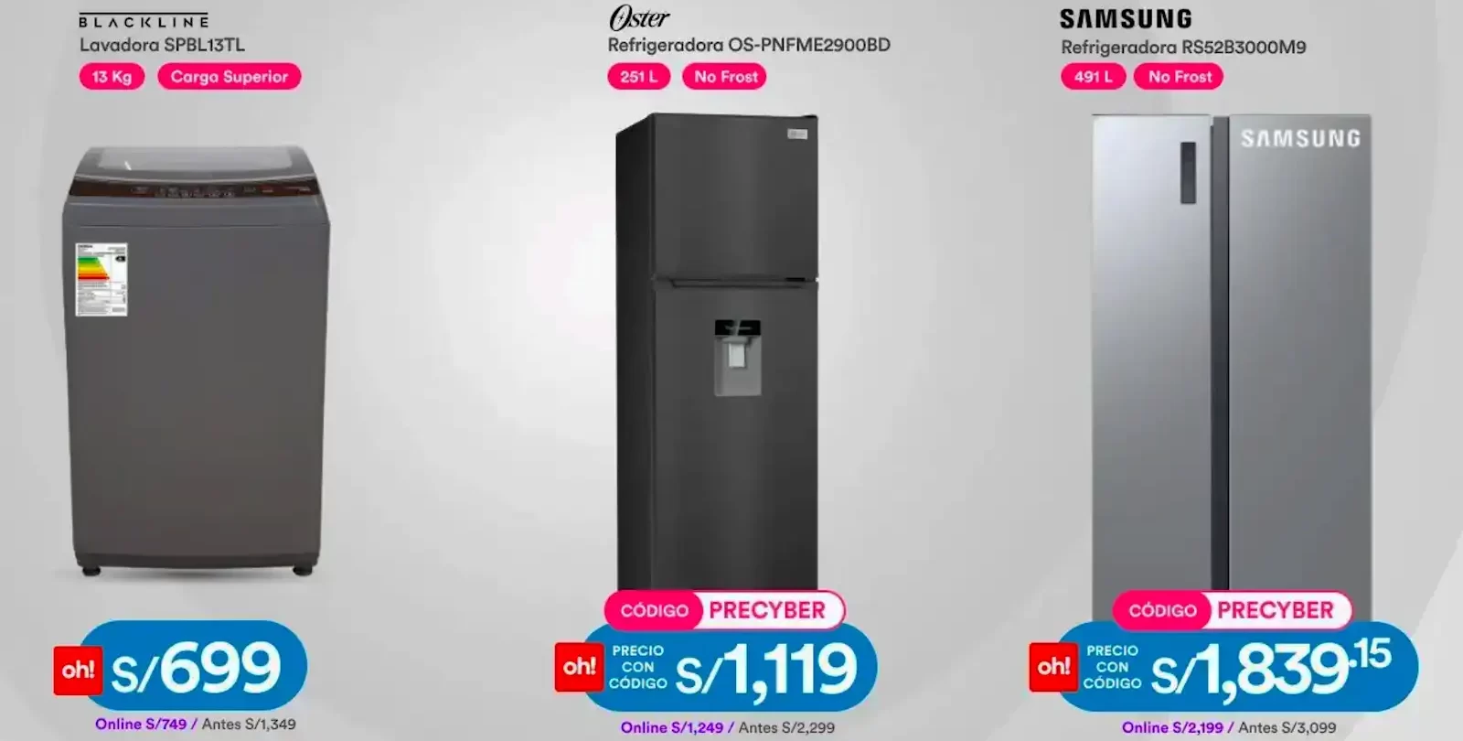 Por ejemplo, puedes comprar una lavadora Blackline de 13 kg por S/749, así como también una refrigeradora Oster de 251L pagando tan solo S/1249.