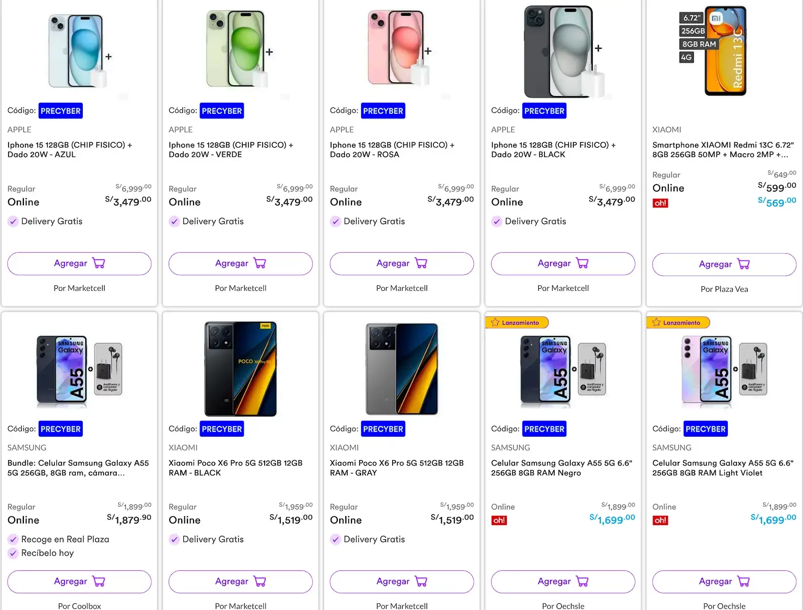Por ejemplo, puedes comprar un iPhone 15 de 128GB por tan solo S/3479, mientras que un Samsung Galaxy A55 5G de 256GB te costará tan solo S/1879.90.