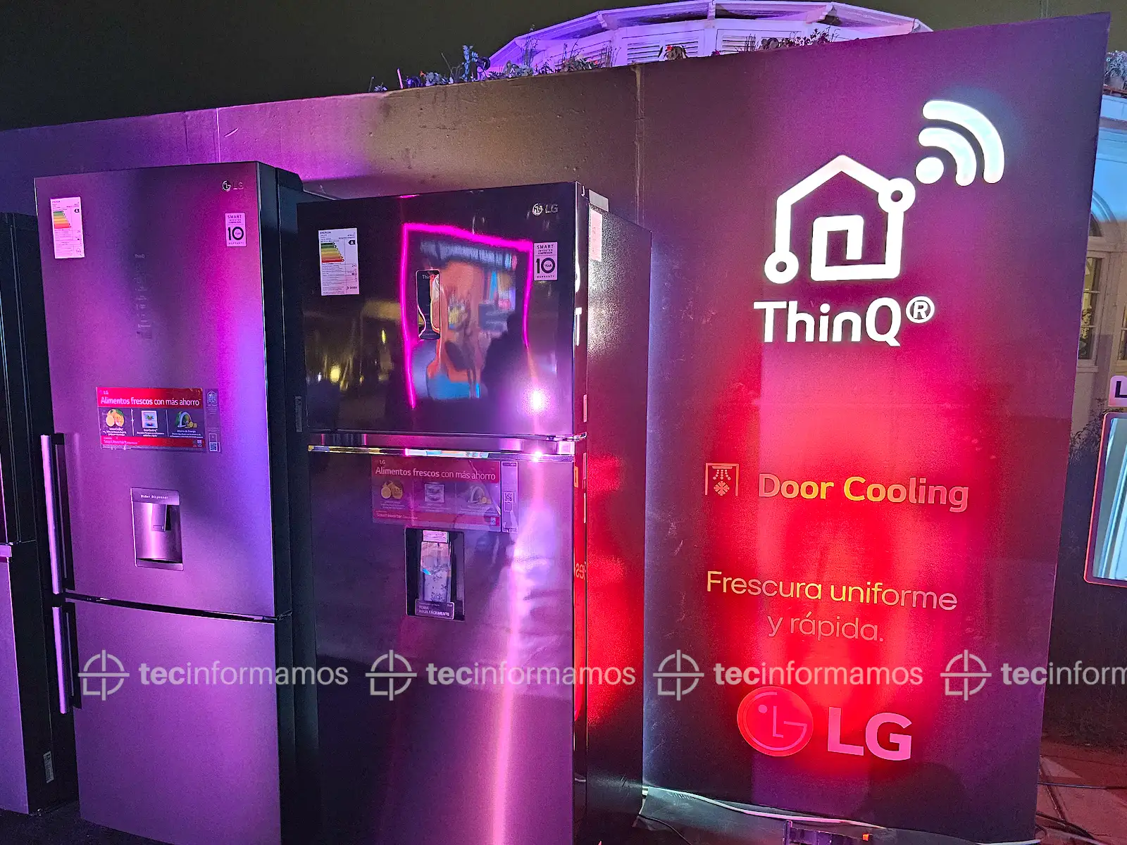 Mientras tanto, cerca de la terraza encontramos a la refrigedora LG French Door LM57SPN de 426L (S/4899) con tecnología ThinQ, así como también con el sistema Ice&Water (agua, cubos de hielo, hielo picado).